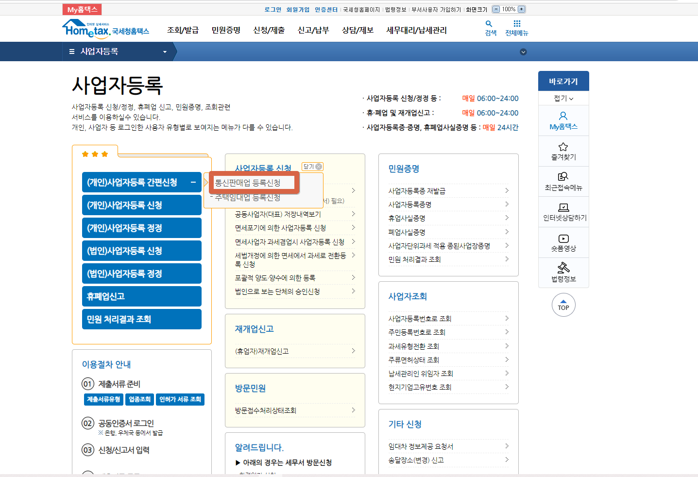 2.개인 사업자등록 간편 신청에서 '통신판매업 등록 신청'을 클릭한다.