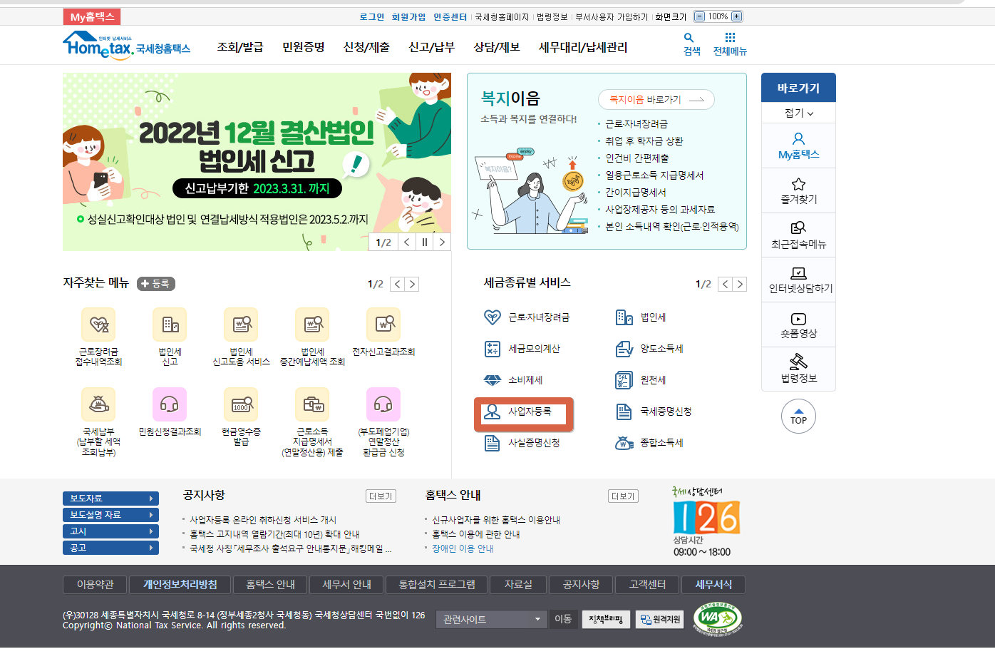 1. 국세청홈텍스홈페이지에 접속 후 아래와 같이 사업자등록을 클릭한다.