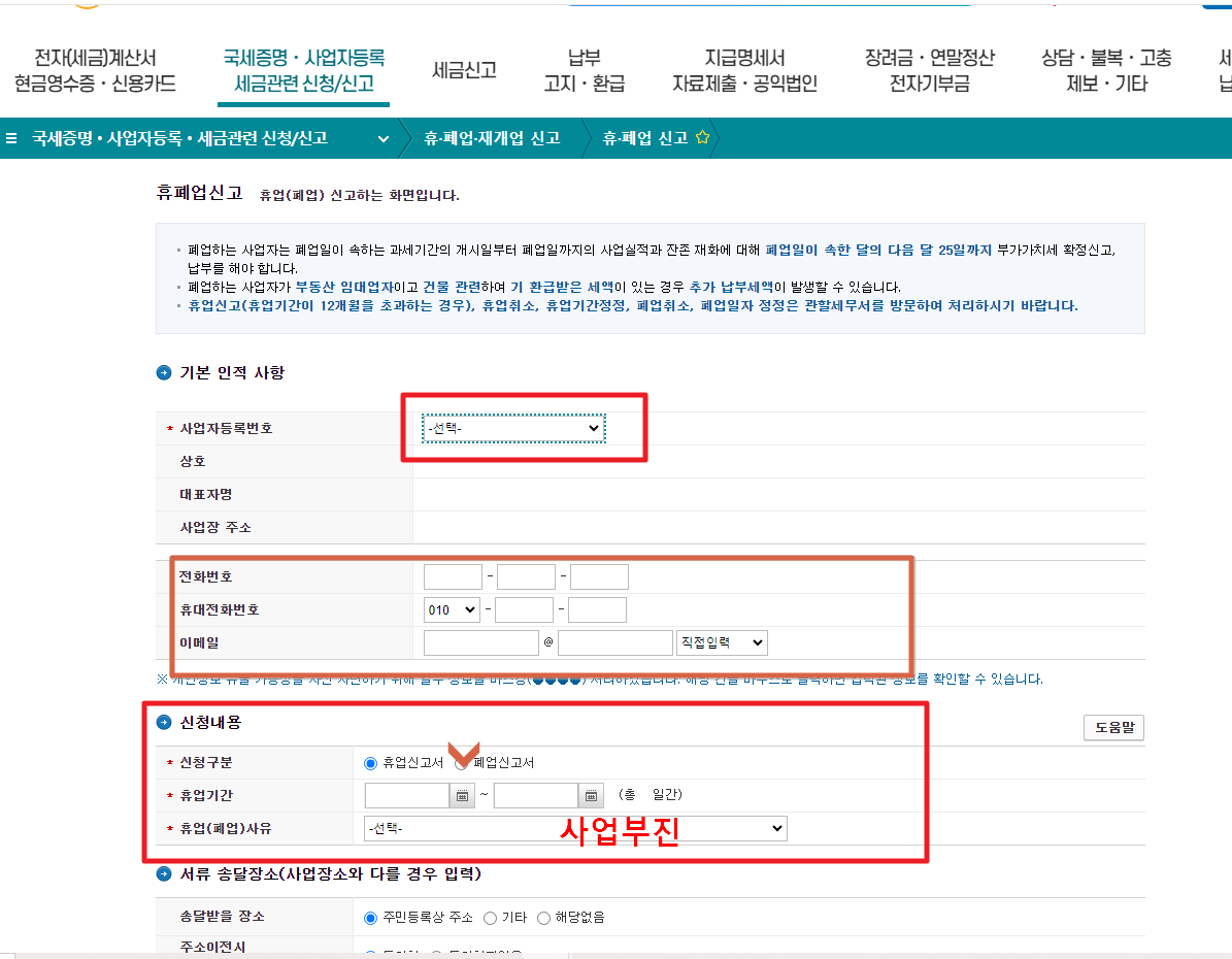 ② 기본 인적사항은 선택란을 클릭하면 사업자번호를 선택할 수 있습니다. 폐업사유에는 각자의 이유를 선택하거나 사업부진으로 선택합니다. 그리고 폐업날짜는 본인 지정하거나 접수일로 해도 됩니다.