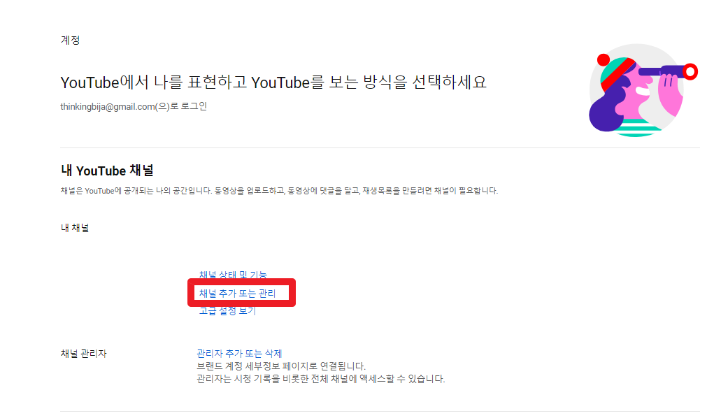1. 브랜드 채널을 만들려면 내 채널에서 채널 추가 또는 관리를 클릭하고 채널 만들기를 체크한다