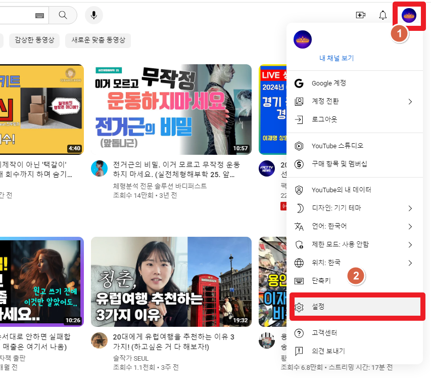 먼저 유튜브채널 맨위 오른쪽 계정 아이콘을 클릭해서 설정으로 들어간다