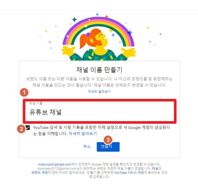 2. 채널 이름을 만들고, 계정생성에 대한 이해를 체크하고 만들기를 한다.
